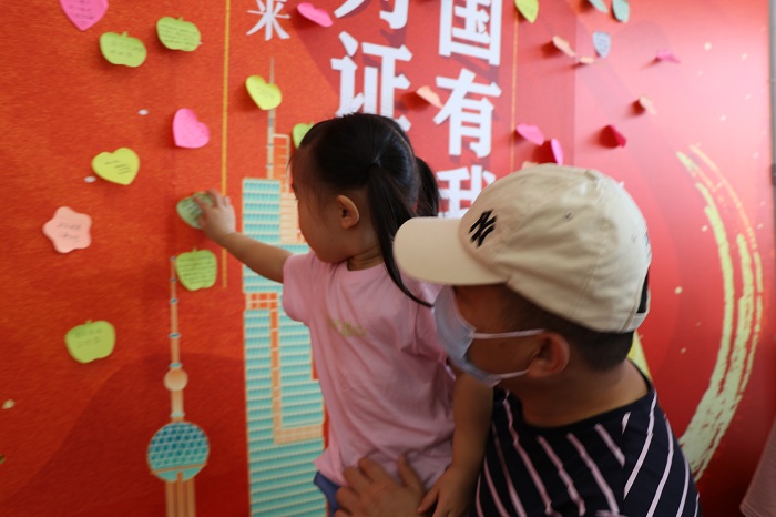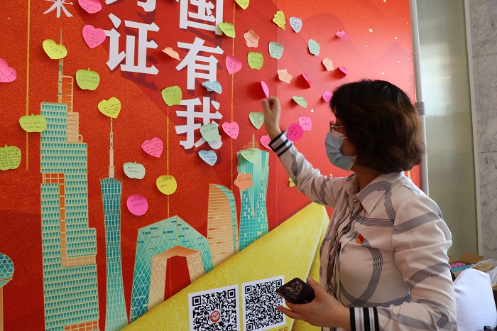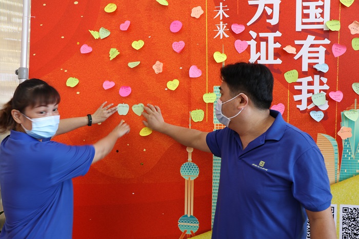 活动现场,来自新百的全国劳模朱爱华郑重写下了自己的寄语“作为一名企业家,见证了民营经济迅猛发展,百姓生活日益提高,我为伟大的祖国感到骄傲。未来,我会带领南京新百全体党员骨干,大力弘扬劳模精神、劳动精神、脚踏实地爱岗敬业,尽职尽责书写新时代劳动者的奋斗之美,为把南京建设成为面向世界的国际消费中心城市,贡献智慧和力量!”“如果爱国只能选择一种颜色,我爱中国红!”今年60岁的上官李军难掩激动地写下祝?;坝铩L岜式恍?,见字如唔,很多小朋友在家长的带领下,一笔一划写下对祖国的热爱,也表达对美好未来的期望。