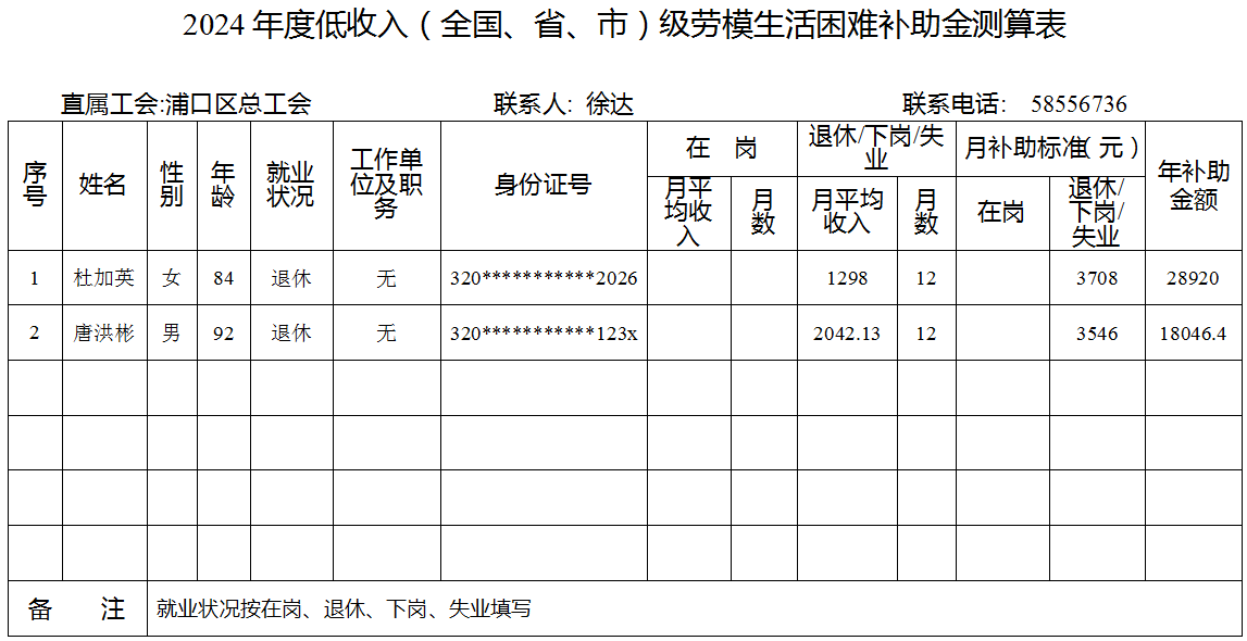 按照南京市总工会《关于做好2024年度劳模待遇落实工作的通知》要求,经个人申报,基层工会审核,江苏省劳动模范杜加英同志2024年度全年收入为15576元,未达2024年度南京市农村居民人均可支配收入(3224元/月),南京市劳动模范唐洪彬同志,2024年度全年收入为24505.6元,未达2024年度南京市农村居民人均可支配收入(3224元/月)。且不具有下列情形之一: