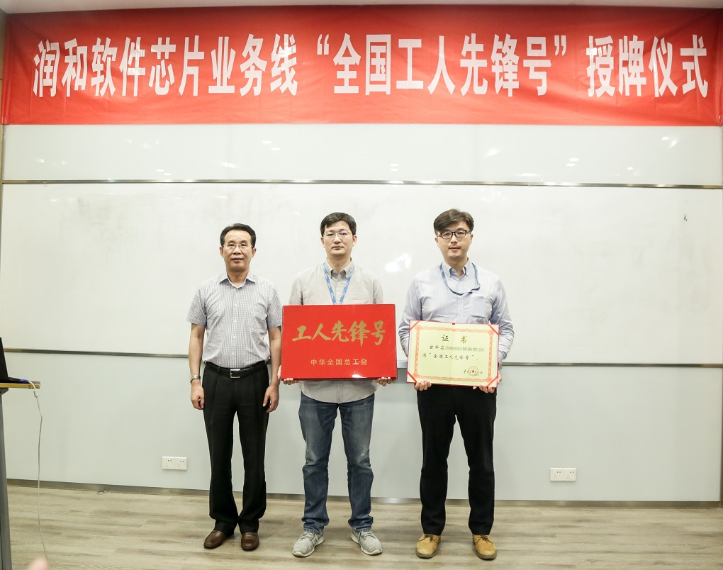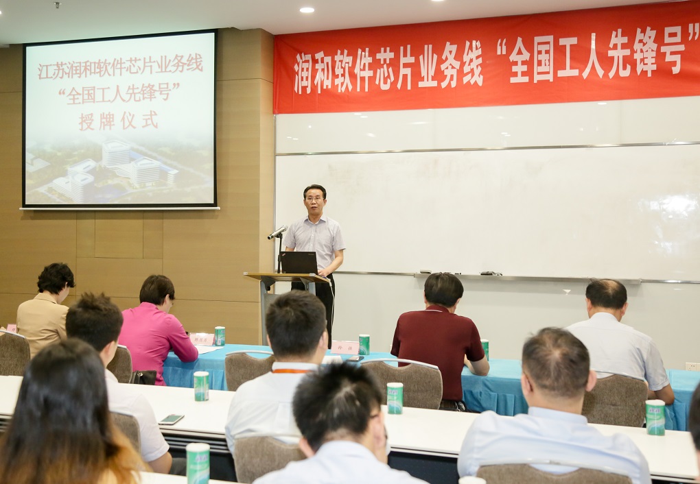 调研期间,还举行了润和软件芯片业务线“全国工人先锋号”授牌仪式,部分中国工会十七大南京市代表应邀参加了交流座谈。孙强书记肯定了润和软件在推进全球信息化建设中所做的贡献。他说:“全国工人先锋号”是中华全国总工会授予基层班组的一项全国性综合荣誉。智能终端事业本部芯片业务线能在全市成千上万个班组中脱颖而出,获得“全国工人先锋号”,成绩有目共睹,荣耀实至名归。多年来,智能终端事业本部芯片业务线,为各类芯片厂商提供全套软硬件解决方案,业务涵盖手机、TV、监控、服务器、通讯、物联网等各类芯片领域,为国产芯片的发展做出了重要贡献,是全市软件企业的优秀典型。希望芯片业务线以及企业的全体员工充分发挥示范、引领作用,大力弘扬劳模精神、劳动精神、工匠精神,以这次授牌为契机、把荣誉作鞭策,抓住芯片发展的机遇,以“国内一流”为目标,在国际舞台上展示润和芯片的实力!为建设“创新名城、美丽古都”、提升省会城市功能和中心城市首位度创造新的辉煌,以实际行动和优异成绩,庆祝新中国成立70 周年!