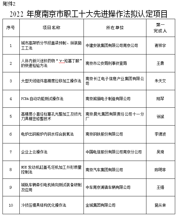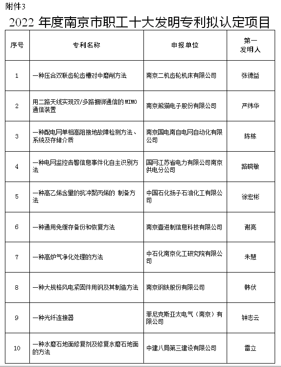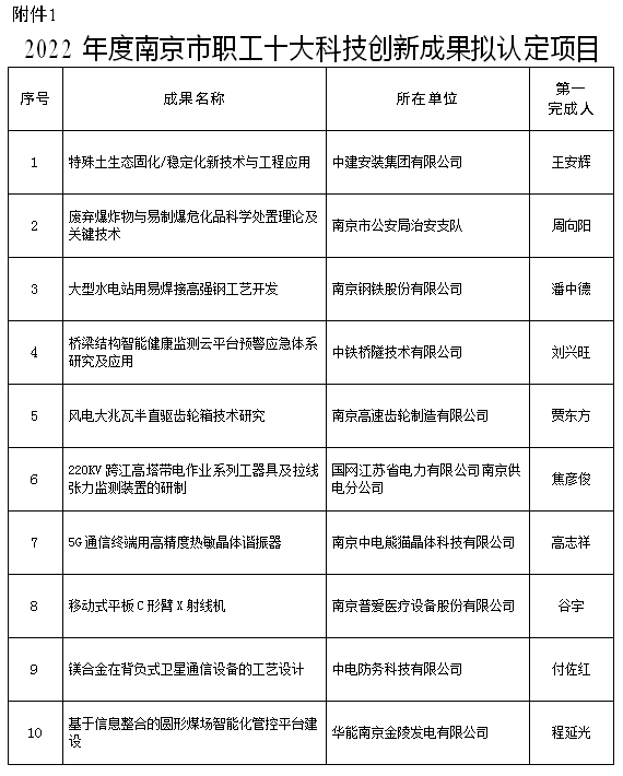 2022年度南京市职工十大科技创新成果、十大先进操作法、十大发明专利评选结果公示